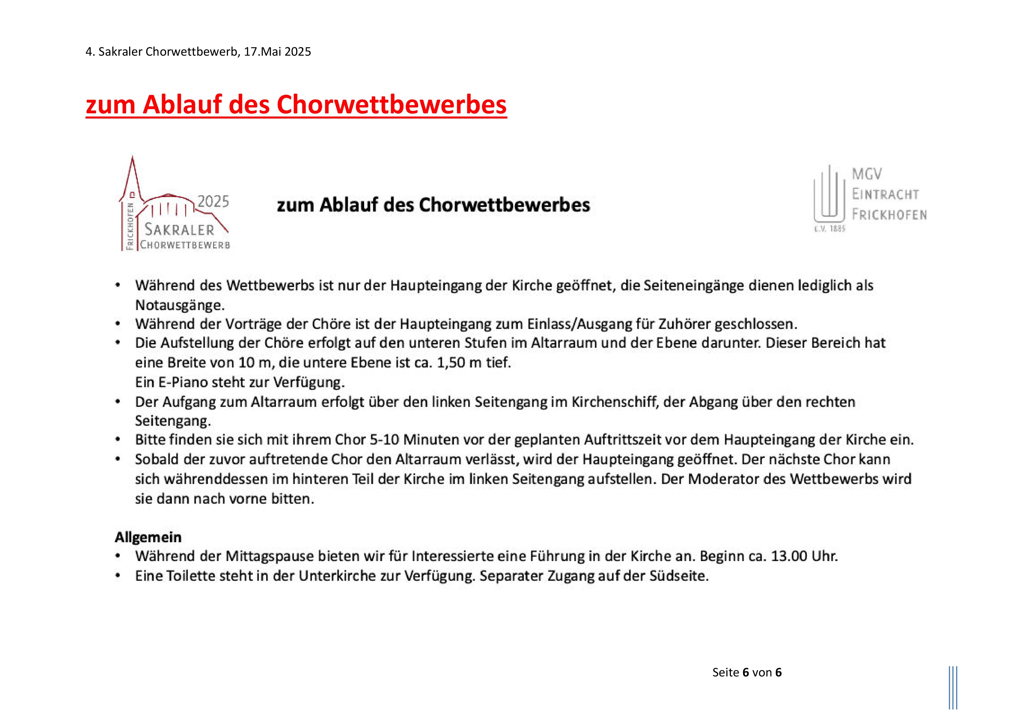 Einen vorläufigen Zeitplan, die Zuordnung zu einem der drei bereitstehenden Ansingräume, einen Ortsplan und allgemeine Hinweise zum 4. Sakralen Chorwettbewerb des MGV "Eintracht" Frickhofen e.V. 1885 am Samstag, dem 17. Mai 2025 in der kath. Pfarrkirche "St. Martin" können Sie an dieser Stelle einsehen/downloaden.