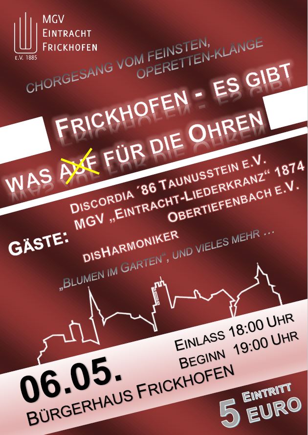 Die Konzertbesucher dürfen sich in einem sehr abwechslungsreichen Programm neben dem MGV "Eintracht" Frichkofen e.V. 1885 auf die Chöre Discordia ´86 Taunusstein e.V. und den MGV "Eintracht-Liederkranz" 1874 e.V. Obertiefenbach freuen. Als besonderer Höhepunkt präsentieren sich dem Publikum zudem die weit über die heimischen Grenzen hinaus bekannten disHarmoniker mit ihrem beliebten Repertoire im Stile der Comedian Harmonists.