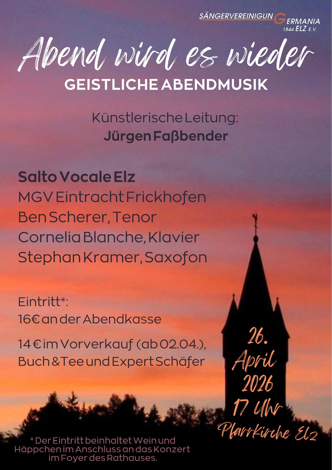 Am 26. April 2026 findet um 17 Uhr in der Pfarrkirche Elz ein Konzert der Sängervereinigung Germania Elz statt, bei dem auch der MGV Eintracht Frickhofen mitwirkt. Unter der künsterlischen Leitung von Jürgen Faßbender können Sie sich auf Beiträge von Salto Vocale Elz, Ben Scherer (Tenor), Cornelia Blanche (Klavier), Stephan Kramer (Saxofon) sowie dem MGV Eintracht Frickhofen freuen, um dem stressigen Alltag für ein paar Stunden zu entkommen. Nach dem Konzert wird es im Foyer des Bürgerhausen noch einen kleinen Empfang geben. Der MGV freut sich, Sie an diesem Vorabend in Elz unterhalten zu können.