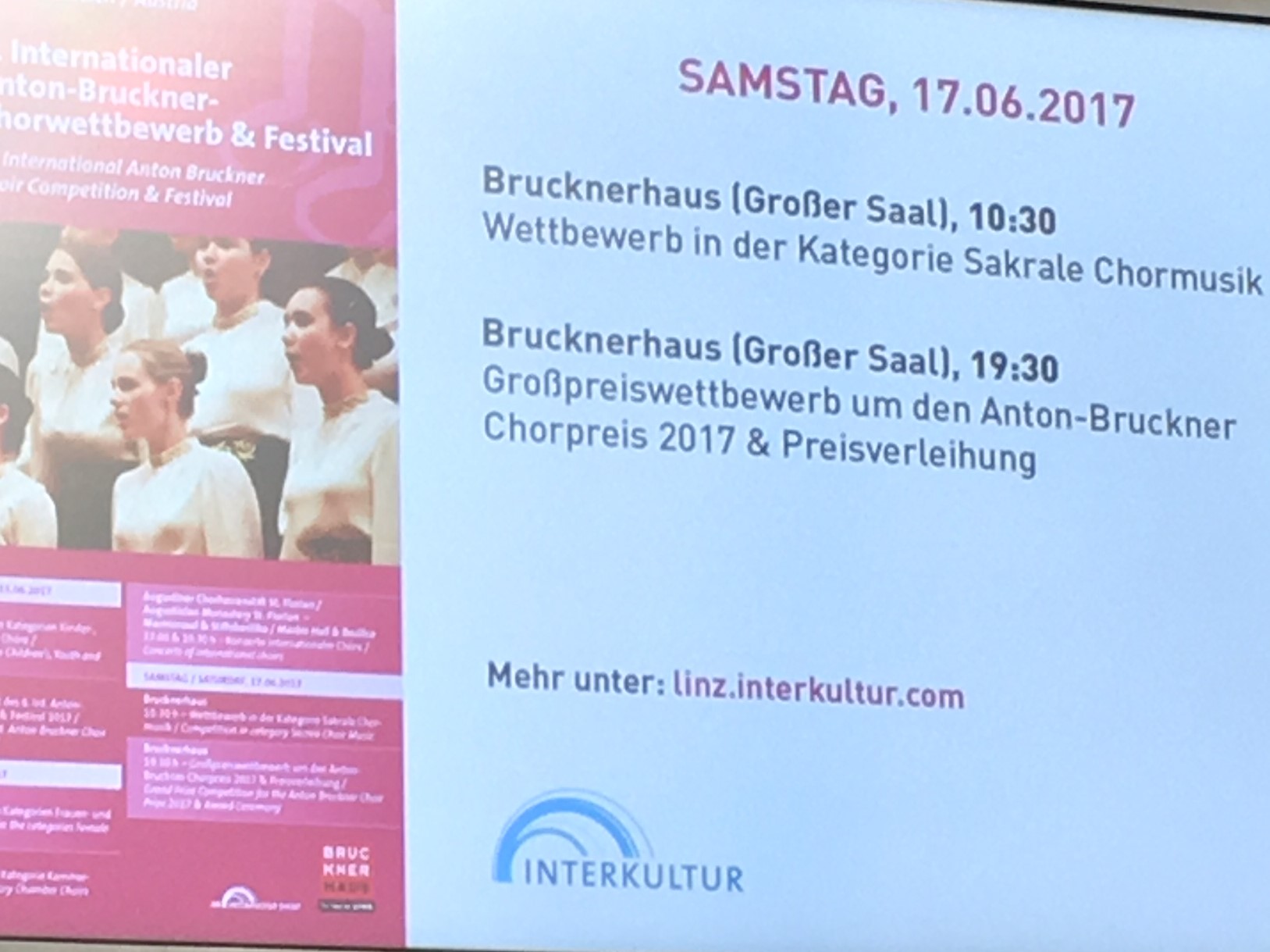 Die Teilnahme am 6. Internationalen Anton-Bruckner Chorwettbewerb in Linz, Österreich in der Zeit von Donnerstag, 15.06.2017 bis Sonntag, 18.06.2017 rückt stetig näher, die Probenarbeit ist in vollem Gange.